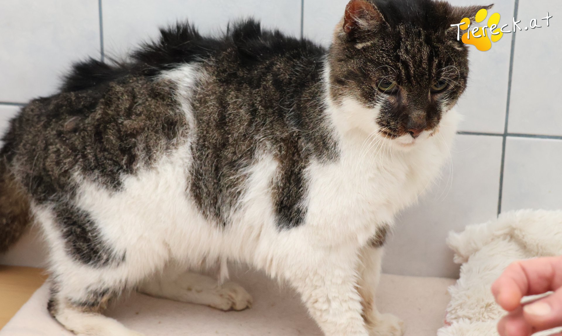 Katerchen ist bis nach Hause nachgelaufen,ist in einem erbärmlichen Zustand. Ohren voller Milben, fast taub, Fell total verfilzt und voller harter Knoten,schlimmer Schnupfen und ein Füßchen dürfte gebrochen gewesen sein, es steht ganz schief. Völlig ausgehungert und durchgefroren,aber er hat Appetit.